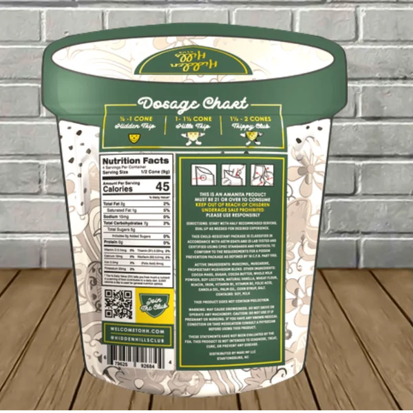 Hidden Hills Trippy Blend Mushie Conez come in a unique resealable container reminiscent of a pint of ice cream. Every container holds two flavor-packed mushroom cones infused with their potent and carefully balanced proprietary magic mushroom blend. Each cone is masterfully crafted and precisely pre-dosed to ensure consistency and potency in every bite!