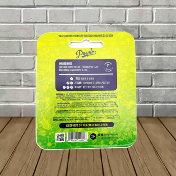 Each 3ct blister package contains six servings, with Purple’s suggested serving size being one-half of a tablet. The Great CBD Shop agrees with this serving size for an adventurer’s initial dosing. Especially if they aren’t a seasoned psychonaut.